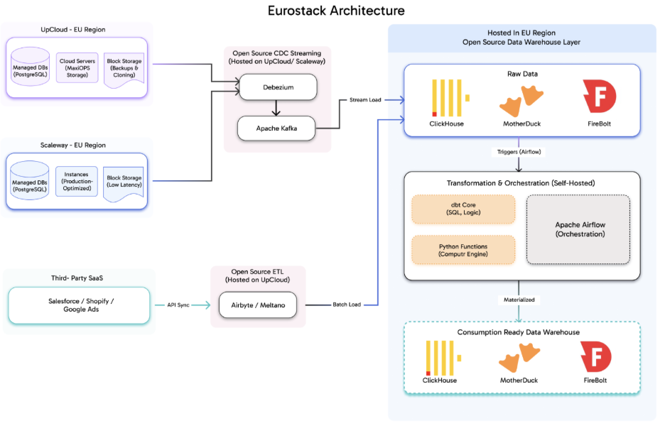 EuroStack is a smarter, faster, and more cost-effective alternative to traditional hyperscalers like AWS or Azure, designed for forward-thinking European companies like Klarna that demand high performance, GDPR compliance, and predictable costs. Instead of relying on expensive proprietary services, EuroStack leverages high-performance European cloud providers, such as UpCloud and Scaleway, to host open-source tools like Debezium (for real-time data streaming via Kafka) and Airbyte (for batch data loading).